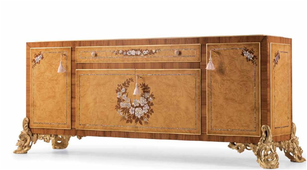 Фабрика Jumbo славится не только роскошной классикой: столовыми, гостиными, спальнями, кабинетами с пышным декором, инкрустацией, резьбой.Последние коллекции смело можно отнести к модному сейчас стилю ар-деко. В этом же стиле вы можете заказать стеновые панели, кессонные потолки и двери. Фабрика Jumbo- это так называемый стиль дворцовой роскоши.