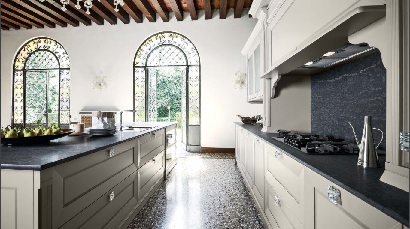 Кухня Etoile фабрики Cesar соединяет прошлое и настоящее. Шелковый лак в мягких, натуральных тонах сочетается с геометрическими пропорциями. Основные цвета: