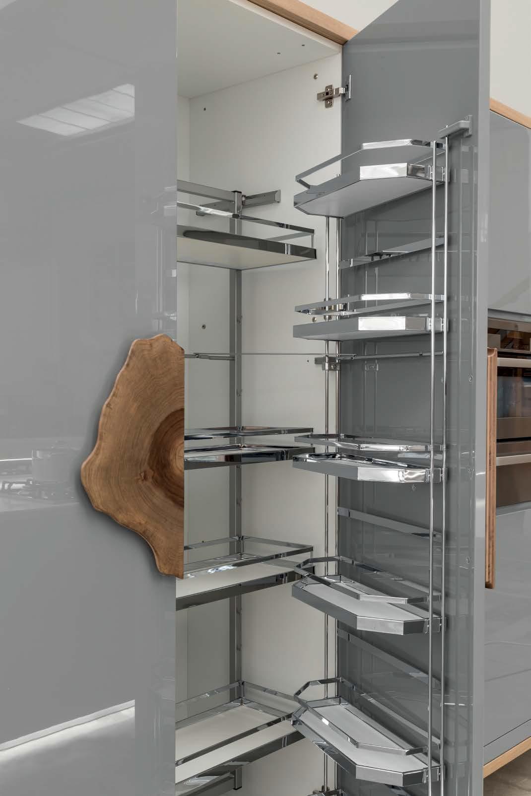 Композиция кухни состоит из модели New York с лакированными фасадами и острова Crana в отделке натуральный дуб. Украшение композиции - ручка Croto из европейского ореха. Основная идея композиции - парящая кухня. Остров кажется висящем в воздухе благодаря алюминиевому цоколю с подсветкой, а ряд колонн подвешен на стене.