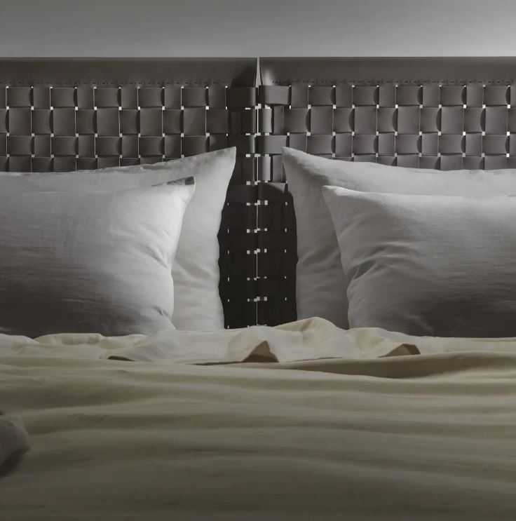 Фабрика Flexform, кровать Cestone, модель 2012 года, дизайнер ANTONIO CITTERIO. Простое основание и шикарное изголовье: какркас из металла с натянутыми в шахматном порядке кожаными ремнями.