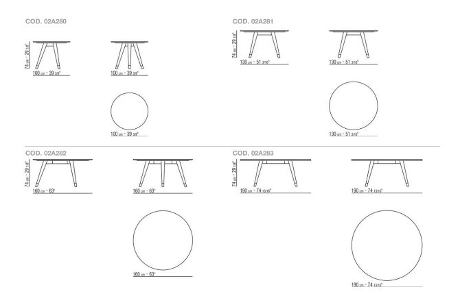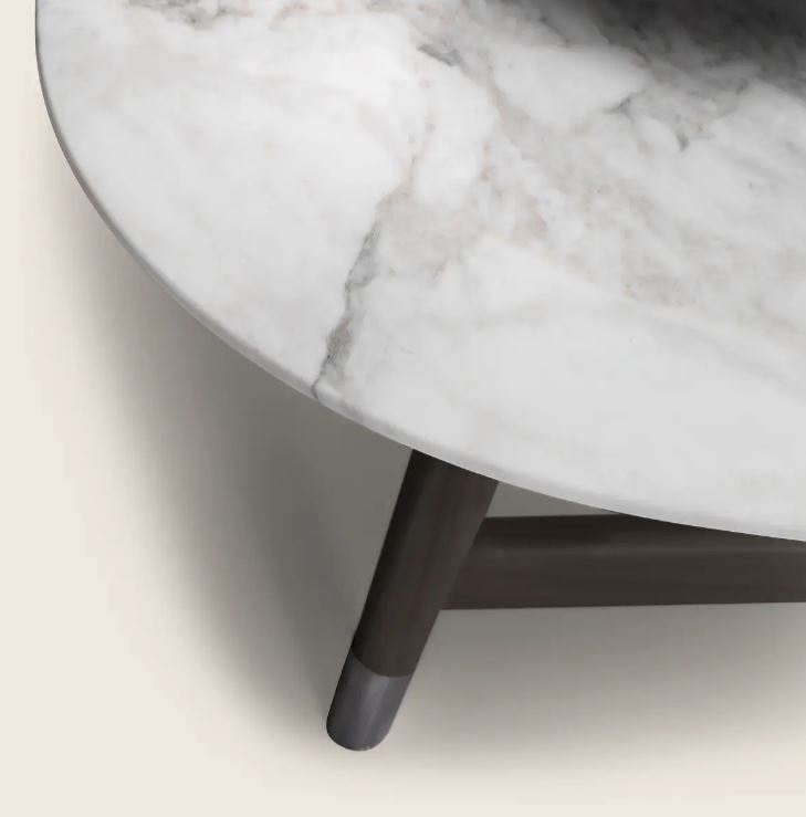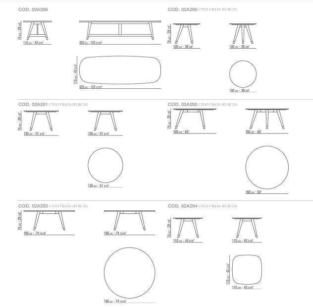 Основание стола имеет точеные ножки из массива дерева в различных вариантах отделки, а столешница предлагается из дерева разных пород в глянцевом лаке одного из цветов палитры или из мрамора.