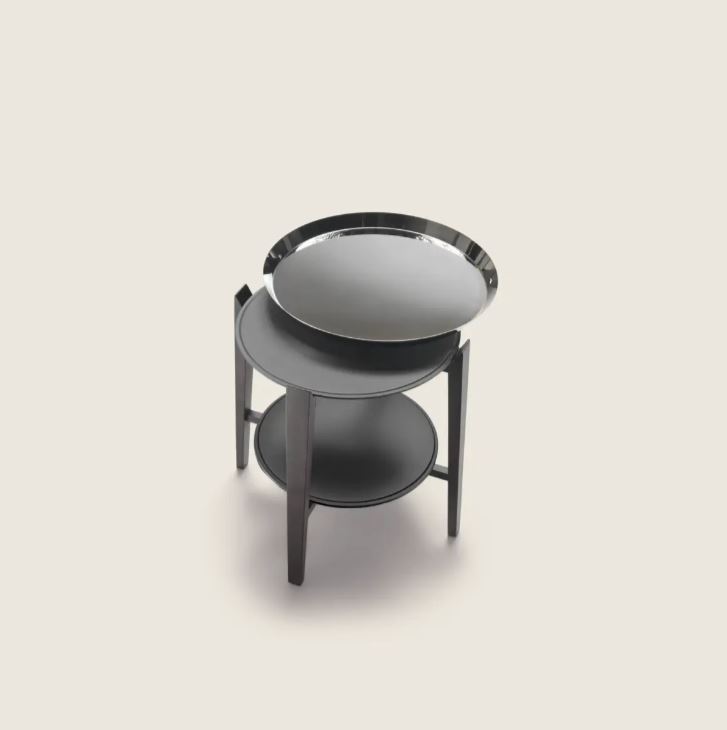 Столик имеет две плоскости, одна над другой, обе из металла, обтянутого кожей. На нижней можно разместить книги или журналы. На верхней плоскости установлен практичный съемный поднос, откуда и взялось название Cabaré.