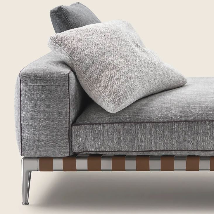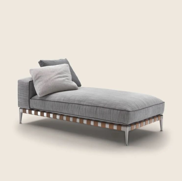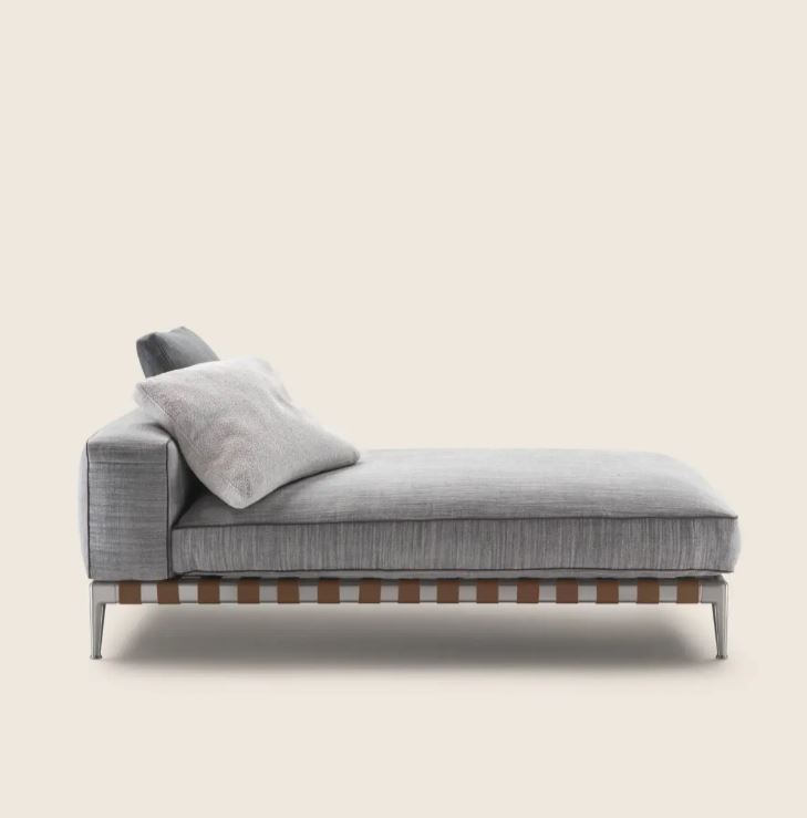 Металлический каркас и ножки кушетки GREGORY из литого под давлением алюминия предлагаются с различной отделкой, что позволяет получить изысканные сочетания с кожей ремней, которая окрашена в один из изысканных цветов по выбору.