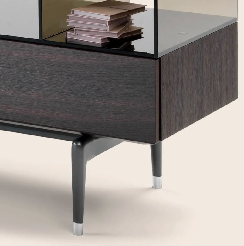 Особый интерес в дизайне тумбы JEREMY представляет сочетание с дымчатым стеклом и грубой материальностью дерева. Корпусные элементы JEREMY предлагаются также в глянцевом лаке.